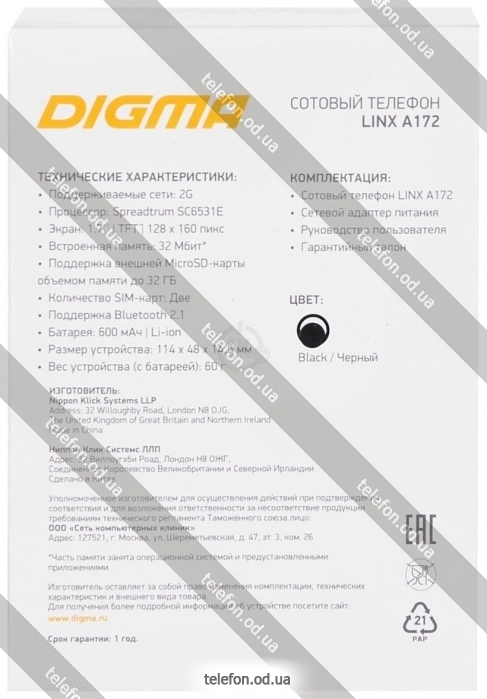 Телефон Digma Linx A172, ОдессаБренд: Digma Весенняя скидка 2026 г. — 10%, экономия: 61 грн.