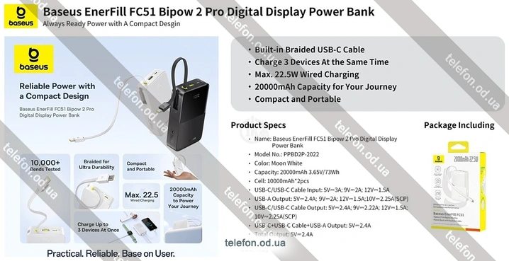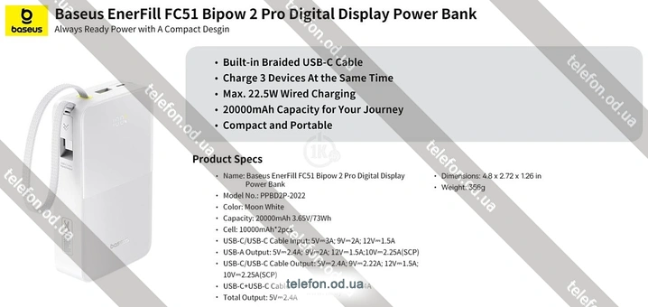 Телефон Baseus EnerFill FC51 Bipow2 Pro Power Bank 20000mAh - купить недорого в Одессе с бесплатной доставкой по Украине |